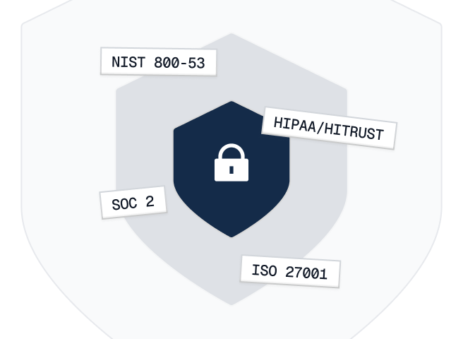 NIST 800-53, HIPAA/HITRUST, SOC 2, ISO 27001 — built in, not bolted on.